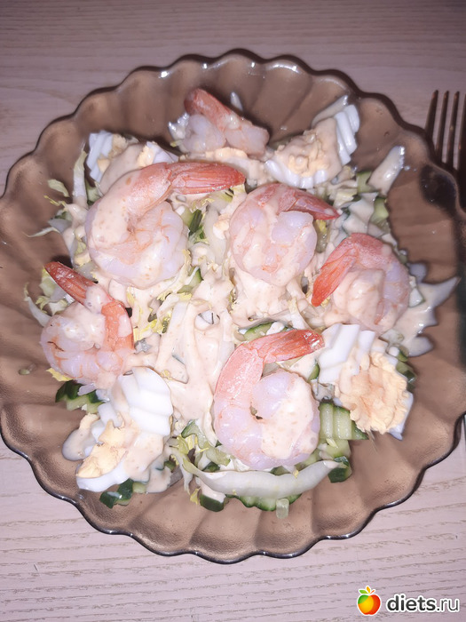 Был мега вкусный салатик. Пекинка, огурец, яйцо и креветки. Полила соусом ореховым. Заказывала на Озон, такая вкуснятина