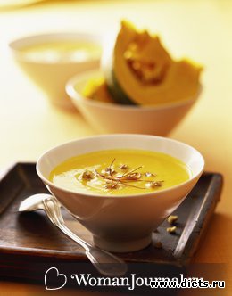 Рецепт супа-пюре с мякотью тыквы и кокосовой стружкой.