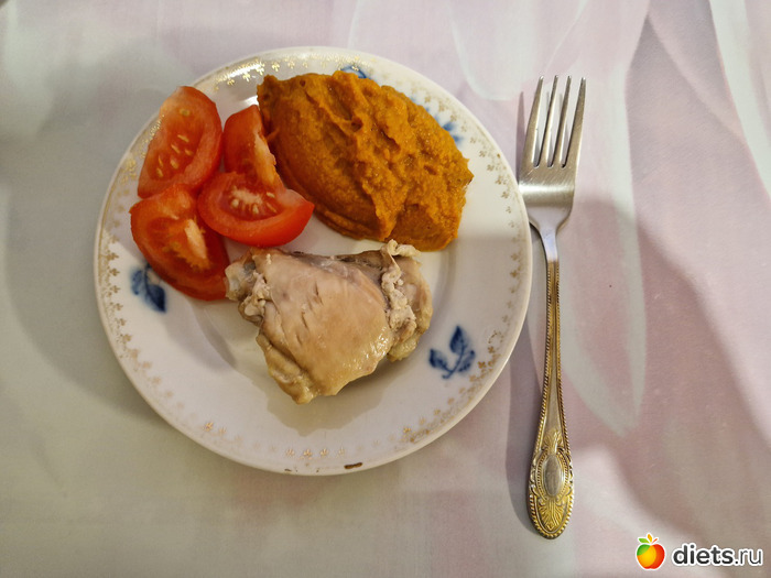 На обед была курица (пассировка), помидорка, кабачковая икра.