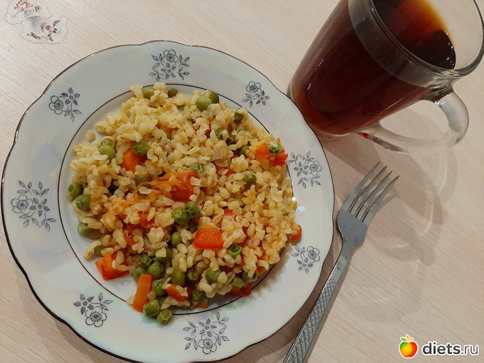 Ужин: булгур с овощами: морковь, репчатый лук, помидоры, стручковая фасоль, зеленый горошек, болгарский перец и чеснок (202 гр) и черный чай с 1 ложкой сахара.