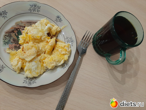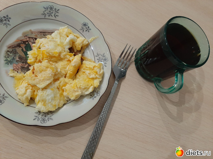Завтрак: хлеб белый (39 гр) с плавленным сыром (47 гр), яичница с молоком (141 гр) и черный чай с 1 ложкой сахара.