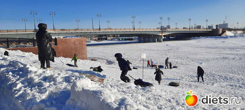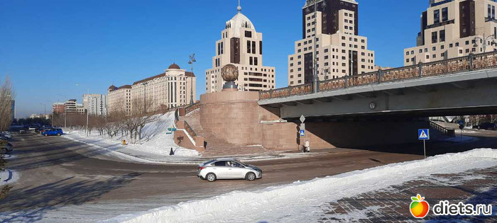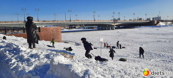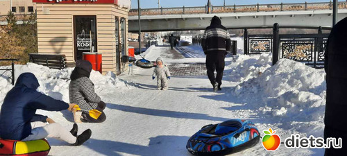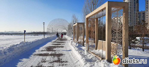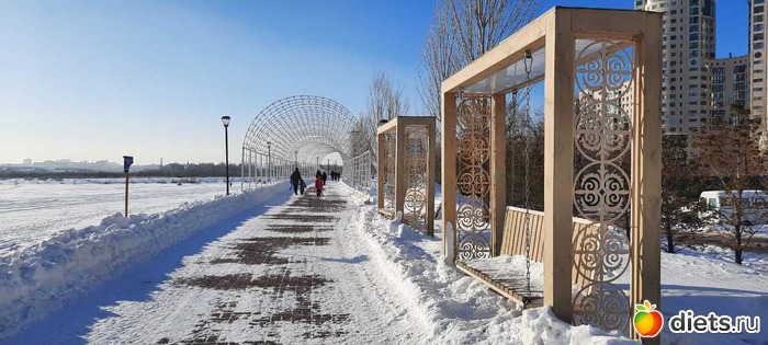 а потом занесло нас в края на набережной нашей реки Есиль, а там прям праздник зимы! Снег ослепительно белый, солнце! Все гуляют, дети с горок катаются, красивые ажурные качели-лавочки, арки,