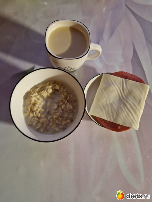 На завтрак каша, бутерброд (хлеб ржано-пш, масло, говядина (нарезка), сыр), кофэ.