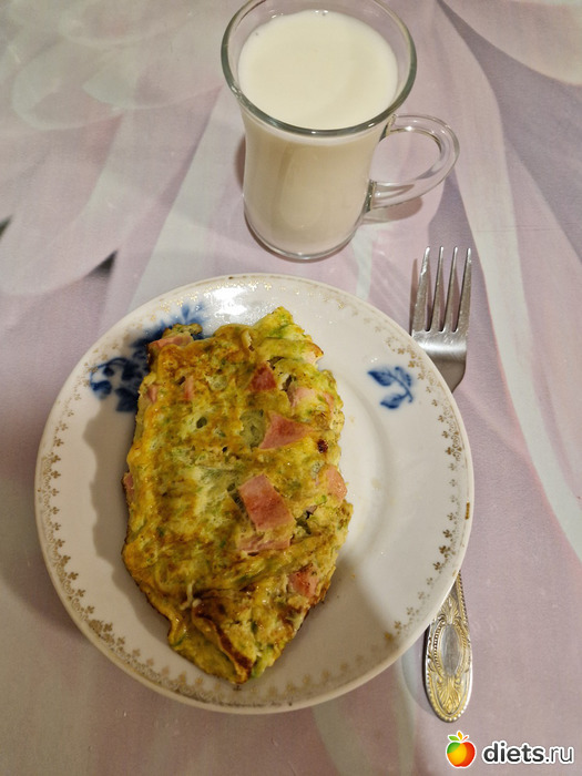 Обед был поздновато, поэтому не стала ужинать. А на обед решила сделать кабачок с яйцом и два ломтика колбасы. Кабачок на мелкой тёрке, два яйца, колбаса кубиками. Всем по такой порции сделала, а себе половинку взяла, а то много целый. +кефир.