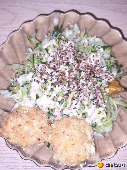 Доела котлетки рыбные и салат, просто пекинка и огурец.
