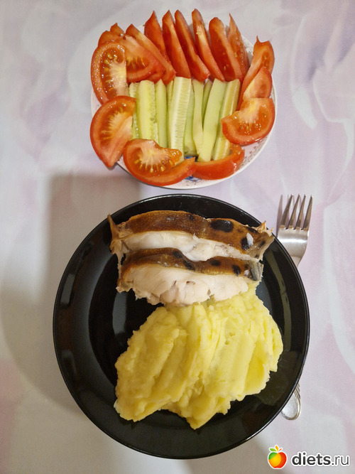 А на ужин была пюрешка с зубаткой г/к (съела только один кусочек), овощи.