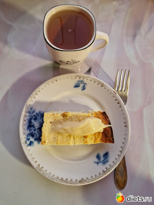На завтрак была запеканка творожная с изюмом и ложечка сгущёного молока, чай.