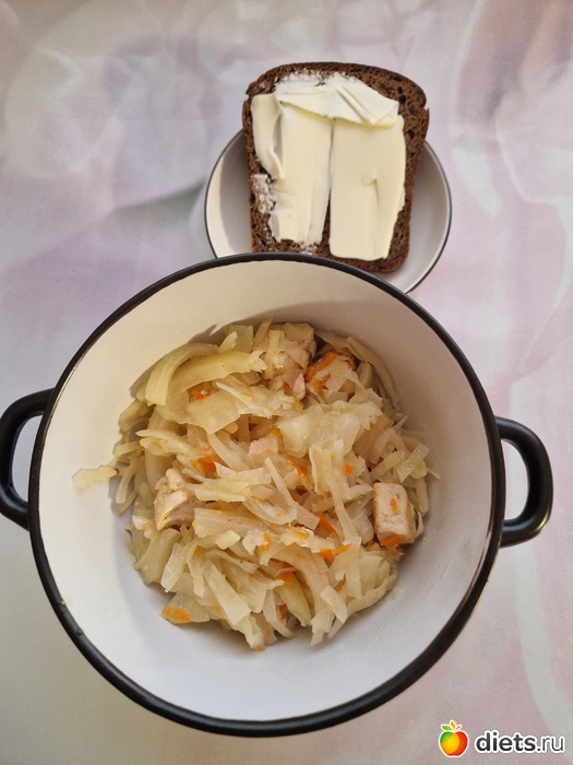 На обед тушёная капуста с куриной грудкой и кусочек ржаного хлеба с маслом.