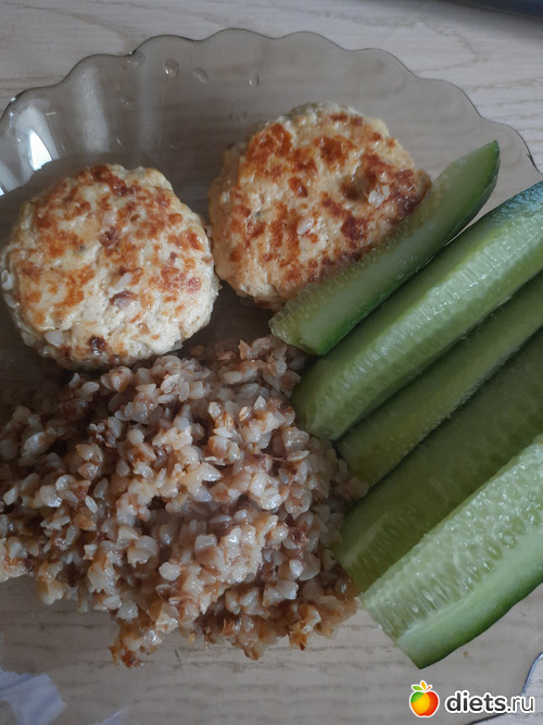 На ужин была гречка с куриными котлетками, они кстати с творогом, у меня сын их обожает, потому что не знает, что они с творогом