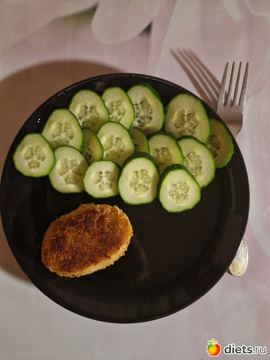 На ужин была рыбная котлетка (тоже из трески) и 1/3 огурца свежего.