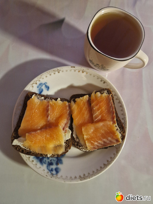 На завтрак чай и два бутерброда с лососем (хлеб ржаной, масло).