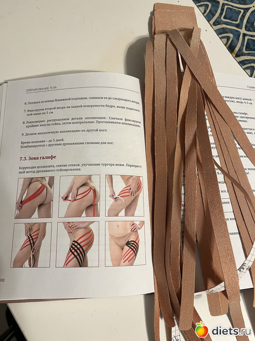 В понедельник наклеила тейпы, криво и сзади сложно на себя клеить без опыта. Посмотрю помогут ли они с отечностью ног. Книгу и тейпы я купила давно, но все казалось, что это самообман в похудении.
