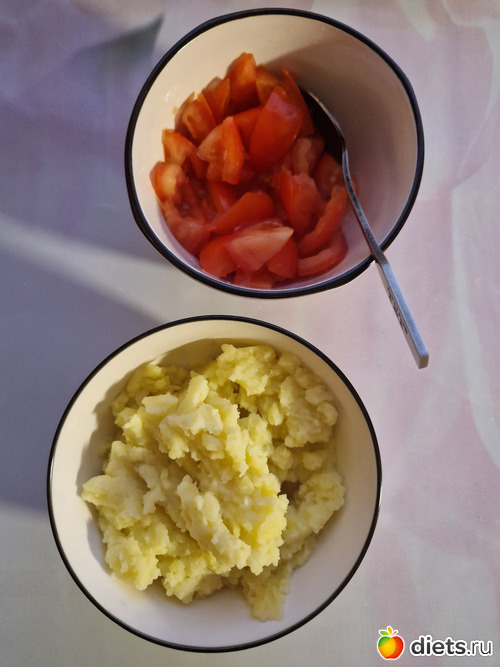 На завтрак картошка (помяла в пюре), салат из помидор (2 шт небольших) с чесноком.