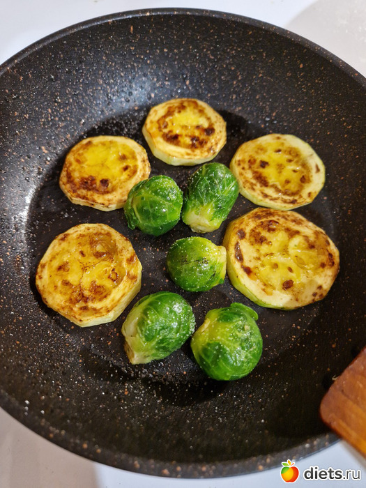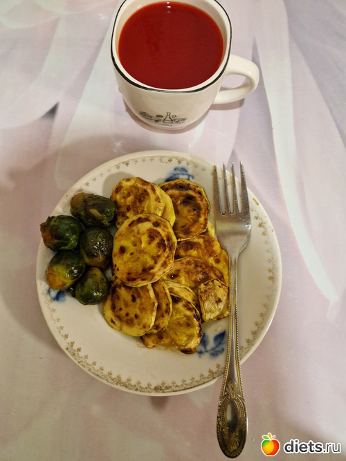 Обед пропустила, на ужин был кабачок, брюссельская капуста и овощной сок.