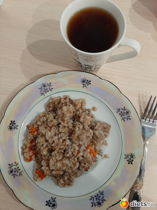 Обед: гречка с мясом (280 гр), 2 печенья (31 гр) и черный чай с 1 ложкой сахара.