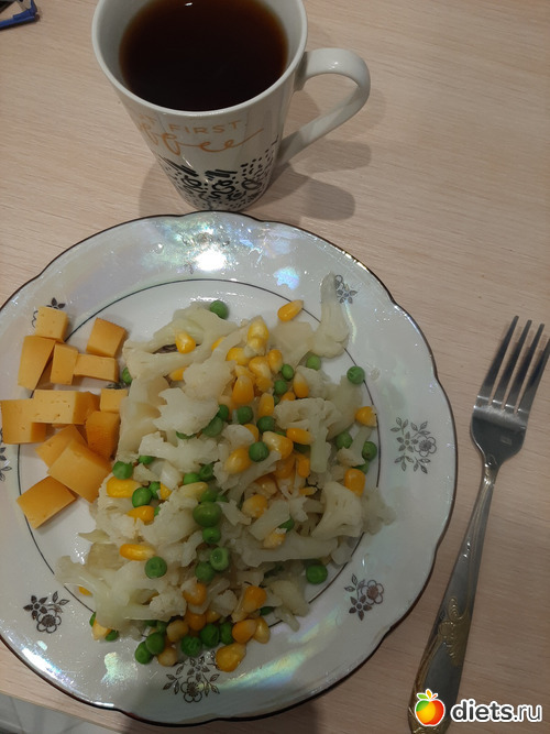 Ужин: отварные овощи (цветная капуста, зеленый горошек, кукуруза) (278 гр), сыр (47 гр) и черный чай с 1 ложкой сахара.