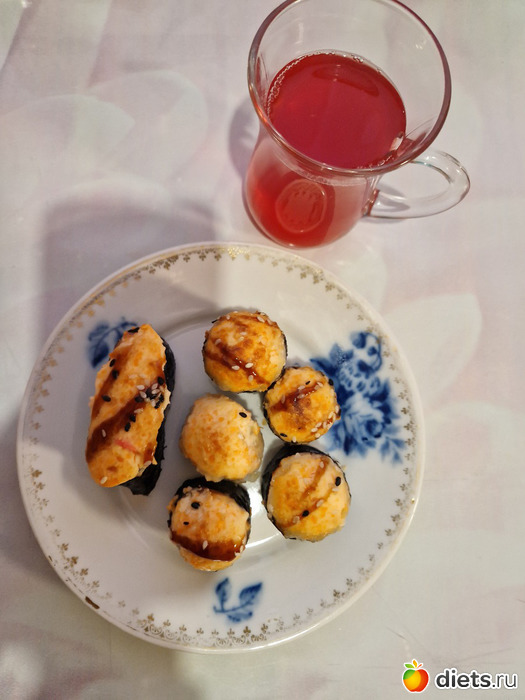 Хоть и не скажу, что очень много вчера было съедено, один кусочек пиццы, штучек может 5-6 суши, один небольшой кусочек торта и это всё в 18.00-18.30. Но не решилась взвеситься сегодня всё-таки.