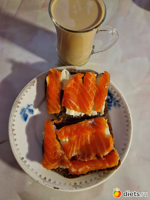На завтрак: кофе, два бутерброда (ржаной хлеб, масло, форелька).