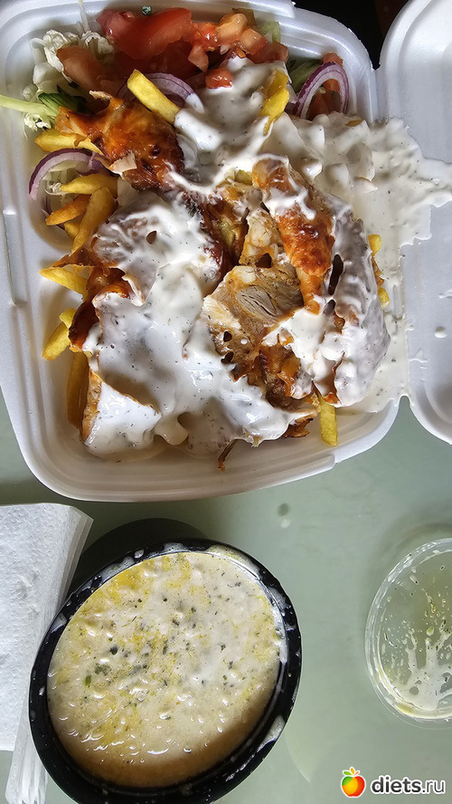 Муж в один из дней работал в Каунасе, возвращался домой обедать. Брали еду из закусочной рядом с домом, ему шаурма сверху, мне суп из шаурмы снизу