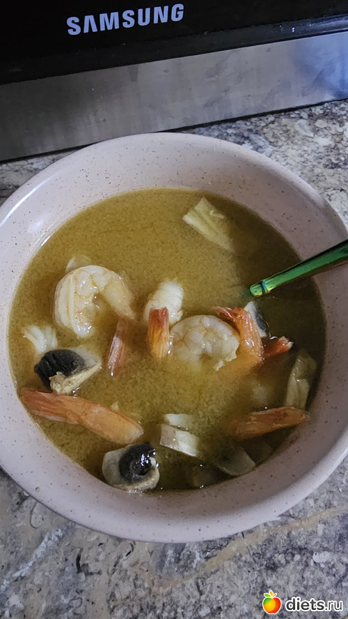 И суп том-ям с креветками, выпал ему по карточке. Креветки правда положил с панцырем