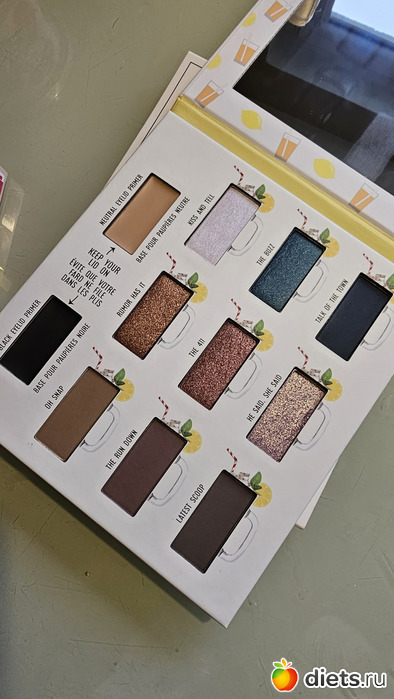 В чем фишка - в палетке 9 оттенков теней и 2 базы. Каждый оттенок теней может выглядеть по-разному, в зависимости от того, нанесен он соло или на одну из баз. Всего получается 27 оттенков, так же черную базу можно использовать как подводку! Свотчи из интернета, демонстрирующие, насколько базы меняют каждый из оттенков