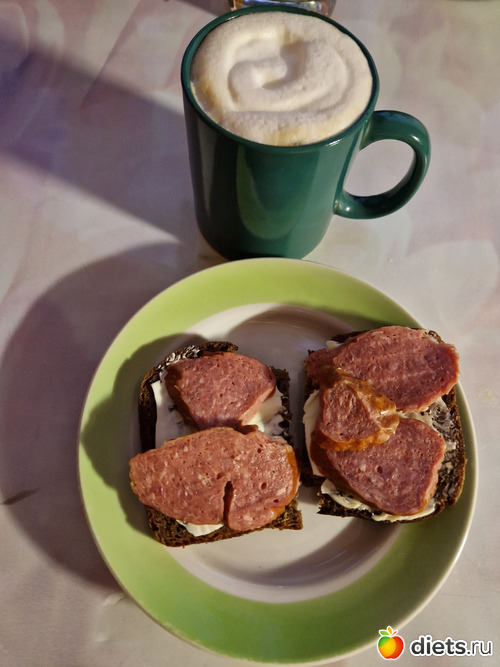 На завтрак сделала латте и два бутерброда (ржаной хлеб, масло, колбаса из телятины).