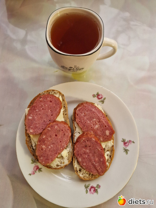 На ланч чай и бутики с колбаской (зерновой хлеб, масло, колбаса из телятины).