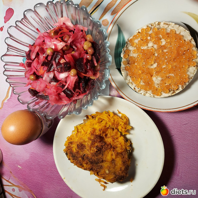 Скумбрия, запеченная с тыквой в духовке, винегрет, яйцо всмятку, хлебец с икрой, что солила.