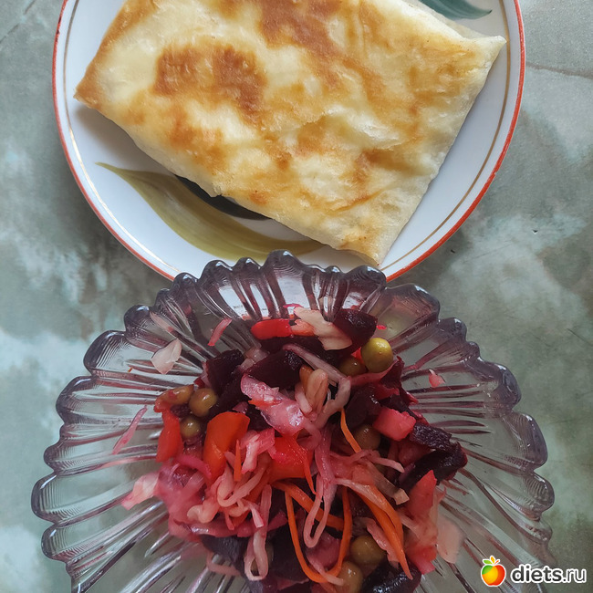 Второе - винегрет, творог с зеленью в лаваше и на сковородочке