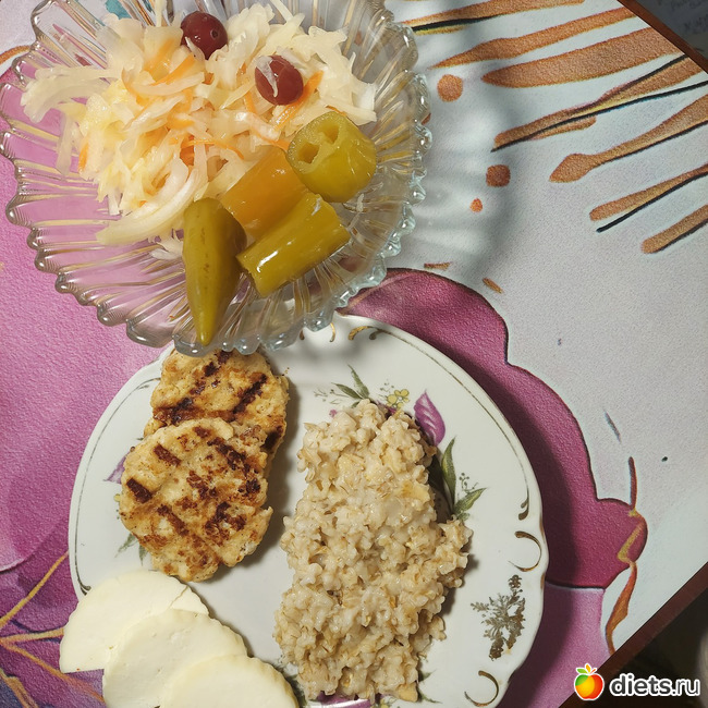 Овсянка, курино-индюшиные котлеты на эл.гриле, квашенная капуста и соленый перец,