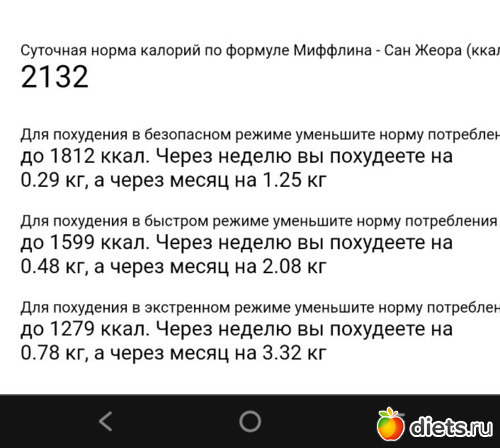 А вообще, надо вести наблюдение, на каком примерно каллораже вес начинает идтиивниз, на каком останавливается. Все эти обезличенные калькуляторы тупые машины... Ориентируюсь на 1700. Хотя еще надо где-то посчитать