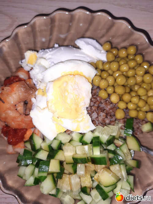 На ужин был план капкан -сделать боул из гречки, с креветками, огурцом, сыром творожным и кукурузой.