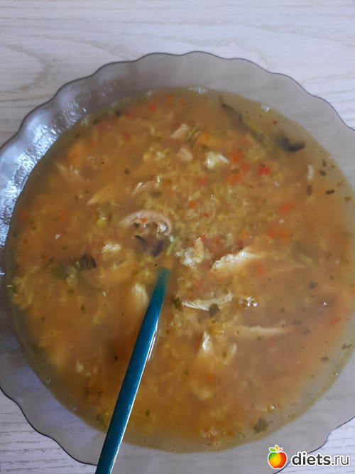 На обед, чечевичный суп, очень люблю его, я в него ничего не пережариваю, только бульон из курицы, аджика домашняя и чечевица