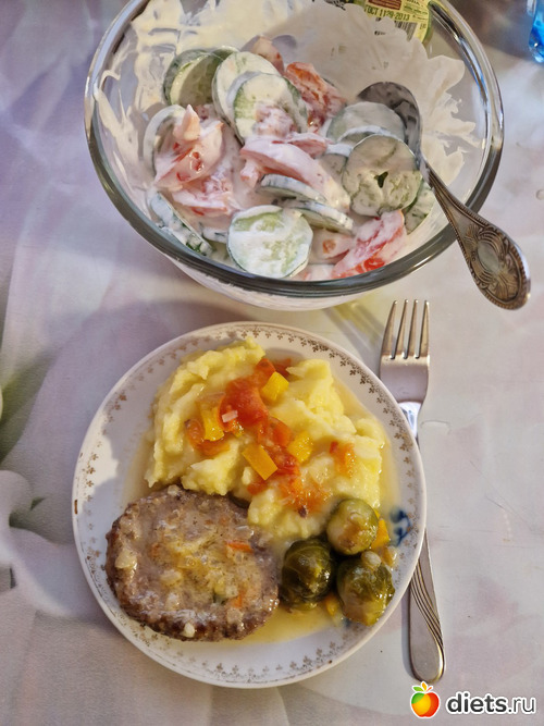 Потом с мужем ездила по его делам, потом за цветами, в магазин. Стала обед готовить (хотела котлеты пожарить с пюре), в итоге, увлеклась...захотелось котлеты с овощами. Нашла в холодильнике перец, помидор, в заморозке брюссельская капуста, +лук и чесночёк). Приготовила ближе к 14.30, припозднился обед. Салат из помидор с огурцом и сметаной.