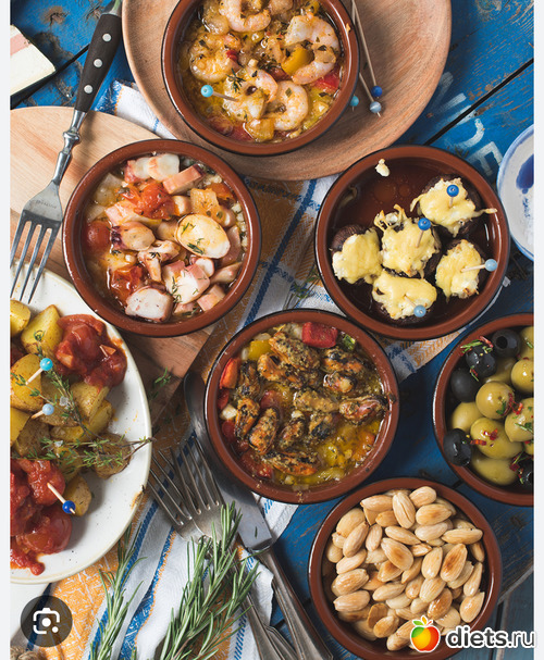 Тапас для меня - это морепродукты, мясо, овощи гриленные, оливки, тортилья.