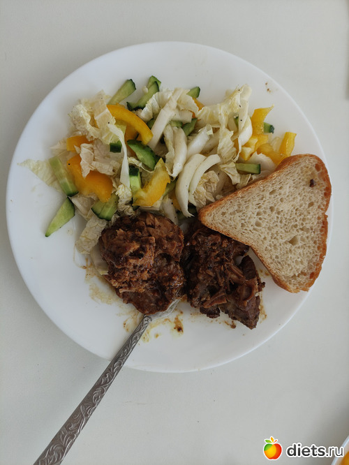 На ужин пропорции мяса, и такой же объем салата, без хлеба.