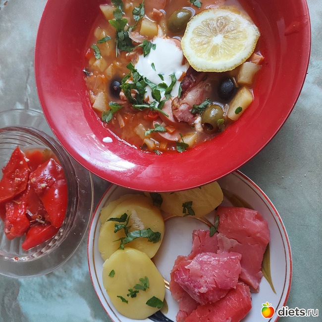 Обед: солянка (невестка передала, чтоб я не похудела )картофель, радужная форель слабо-солёная,