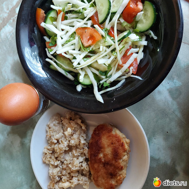 На завтрак : яйцо всмятку, салат овощной, овсяная каша с кусочком масла, котлетка