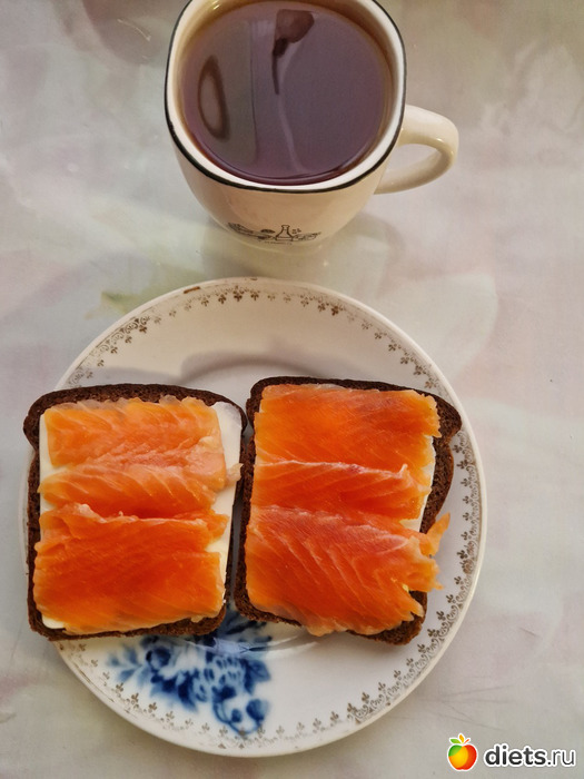 Чай и бутерброды (ржаной хлеб, масло и форель).