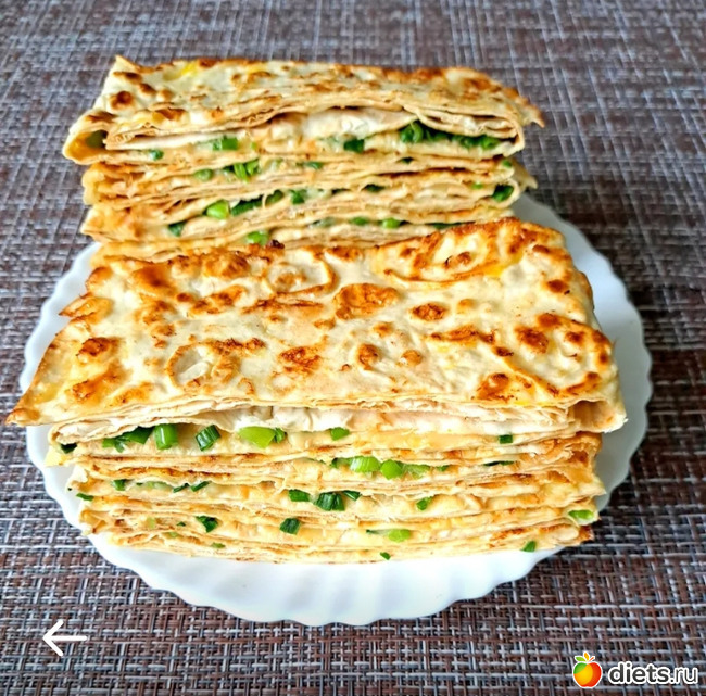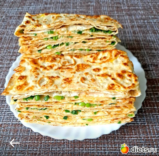 Лаваш в яйце с зеленым луком и сыром готов. Очень вкусно подать его со сладким чаем. Приятного! 223кКал/100г.