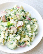 Смешать сметану с одним вареным желтком, солью, перцем, можно капельку горчицы добавить - получится заправка. Все остальное покрошить и заправить. Можно просто все покрошить и сметаной заправить, но в первом случае выходит как с майонезом на вкус.
