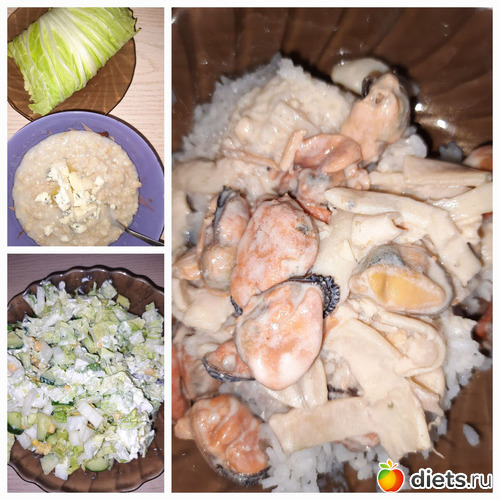 Рис с морепродуктами, потушила мидии с кальмаром в сливках, с сыром с плесенью, что-то такой кусочек вечный и в кашу и с соус, к у меня есть