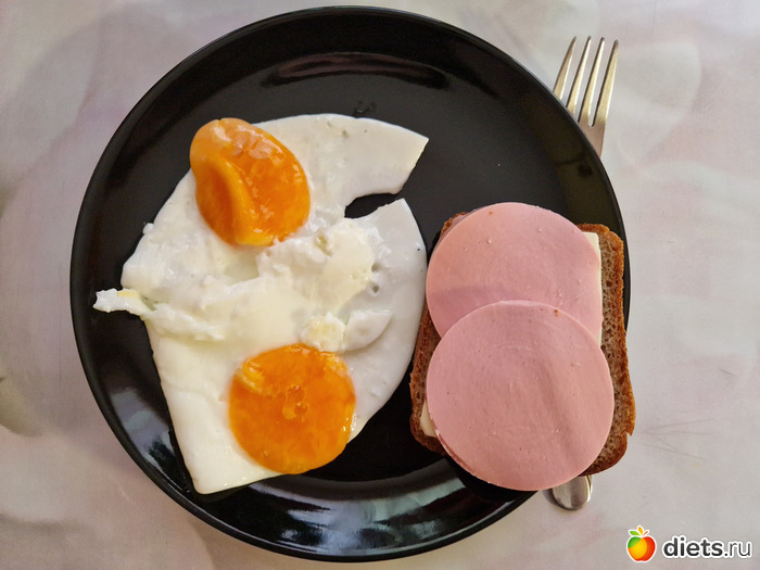 На завтрак два яйца и бутерброд (кусочек ржано-пш хлеба, масло, колбаса).