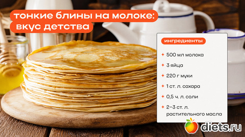 Именно такие тонкие блинчики на молоке часто становятся основной блинных пирогов. Готовится эта вкуснятина в 15–20 слоев со сметанным или заварным кремом и кисло-сладкой ягодной начинкой.