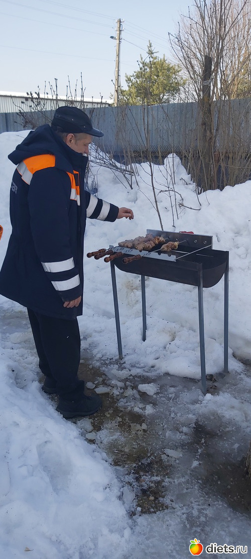 Сегодня проснулись часов в 7 и не спится, солнышко проглядывает. Собрались и поехали на дачу, надо было печку протопить, чтоб дочь с внуком не замерзли. Пока мангал разожгли. Муж приобрел себе ленивого шашлычника, мы его опробовали. Классная штука. Мясо насадили, шампура в специальную рамку вставили и включили. Шампура постоянно не спеша вращались. А муж пока в это время лед отбивал, чтоб не скользить по дорожкам. Периодически подходил и смотрел. как там наше мяско, не подгорает ли...