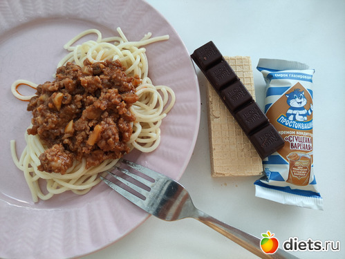 но пока я гуляла по ТЦ. Муж приготовил пасту болоньезе. Решила не много положить убрав одну вкусняшку. По итогу оказалось так вкусно, что ещё положила половину сто на фото и убрала вафлю и шоколад