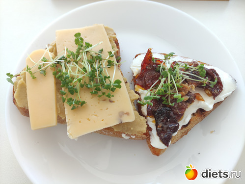 Завтракала не по диете, (фрукты на утро мне не оставили) были бутер хумус и сыр и творожный сыр с вялеными томатами.