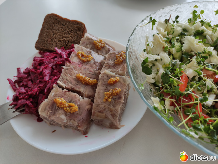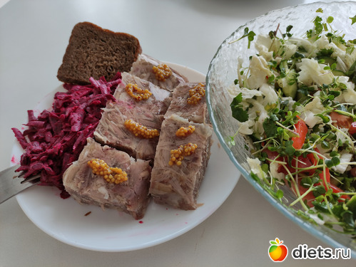 Позавчера на белок кушала холодец, свекольный салат и овощного немного на обед. На ужин вполовину меньше холодца и овощной салат. Завтрак кофе и банан