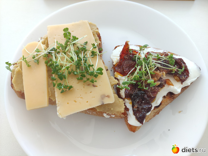 Завтракала не по диете, (фрукты на утро мне не оставили) были бутер хумус и сыр и творожный сыр с вялеными томатами.
