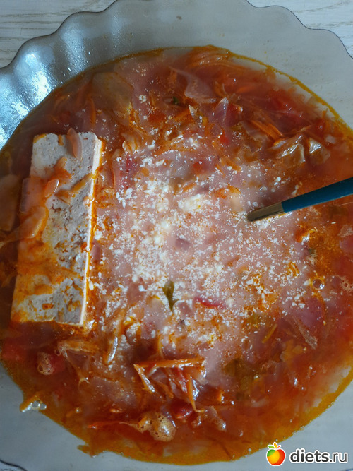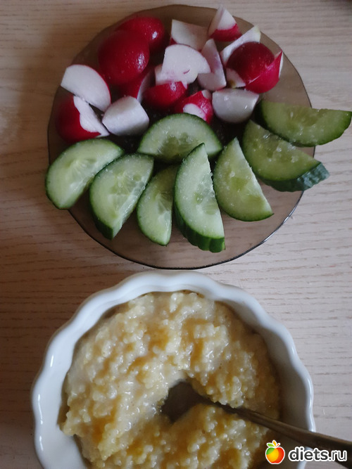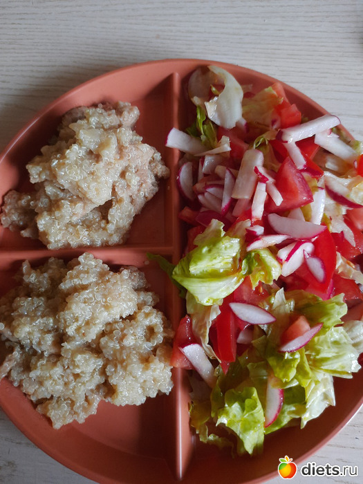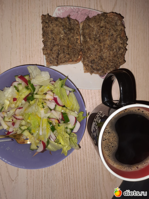 А так позавчера на завтрак салат и бутеры с икрой грибной, на обед щи, перекусила апельсином, на ужин, киноа с соевым мясом, салат.